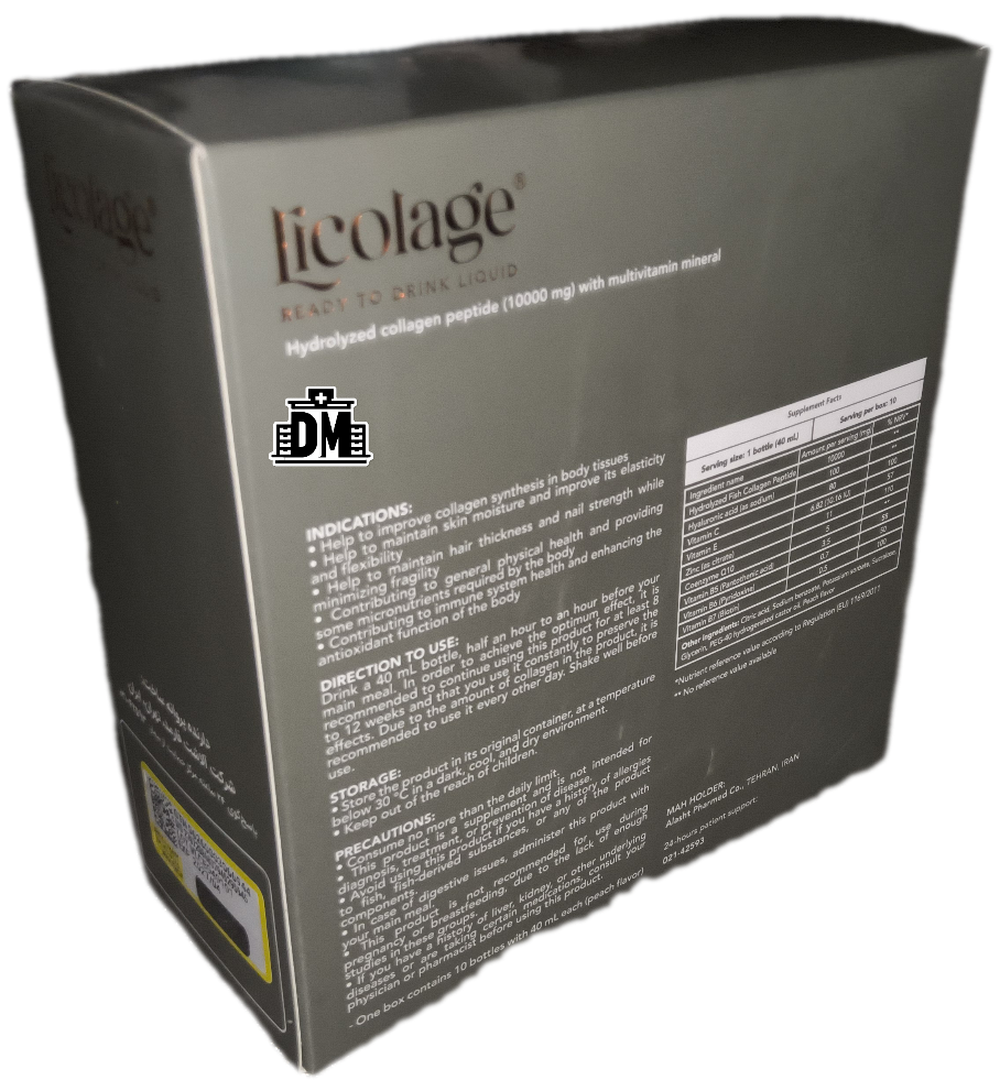 محلول خوراکی لیکولاژ حاوی پپتید کلاژن ۱۰ گرم همراه مولتی ویتامین ۱۰ بطری ۴۰ میلی لیتری با طعم هلو
